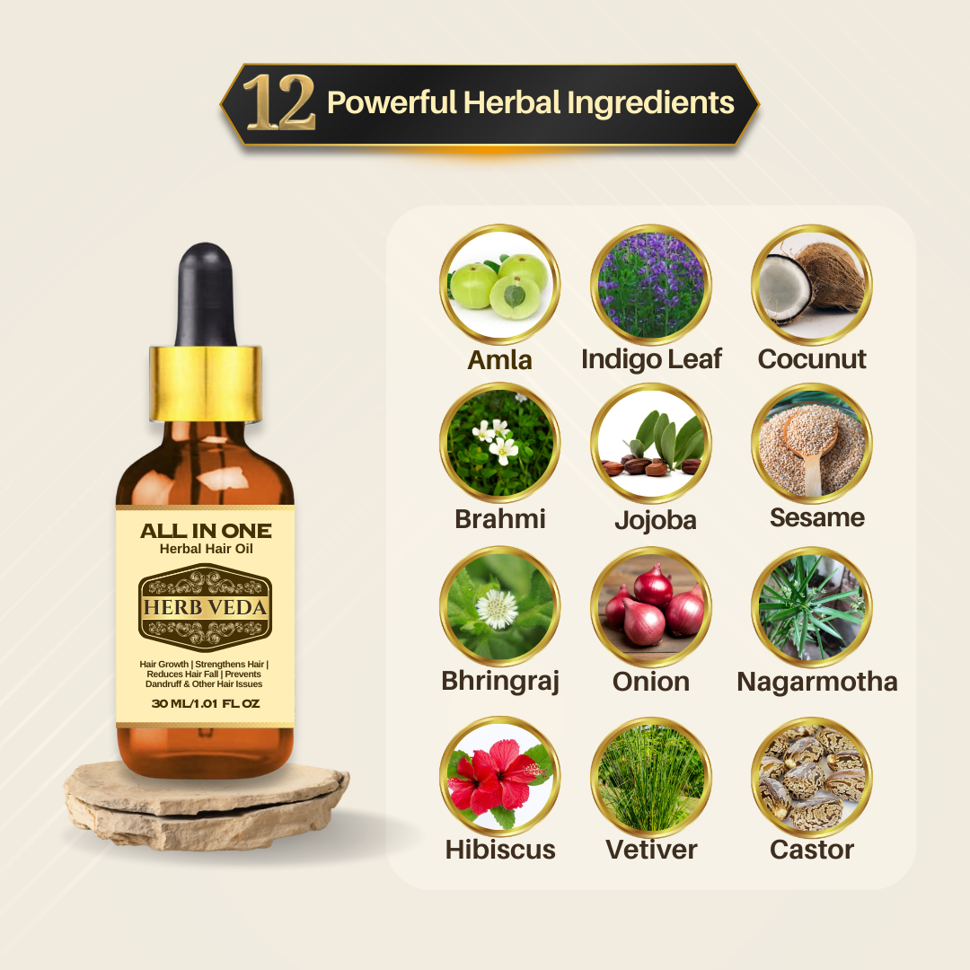 Introducing our All-in-One Herbal Hair Oil, a blend of nature’s finest ingredients Which is Made Of the goodness of :
